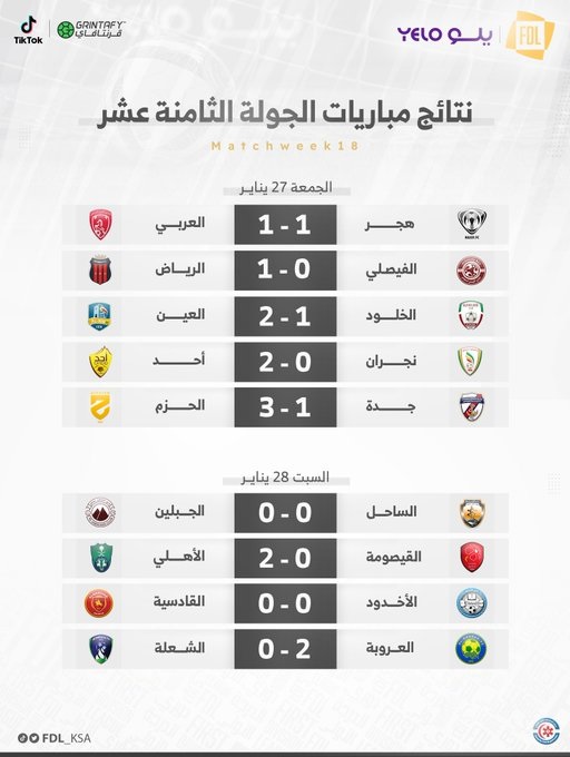 . ***** دوري يلو لأندية الدرجة الأولى للمحترفين موسم 2022 - 2023 ✅ 6 انتصارات 🤝 3 تعادلات ⚽️ 23 هدف - نتائج مباريات الجولة الـ21 من #دوري_يلو http://www.sahat-wadialali.com/vb/up...1676495545.jpg ***** |