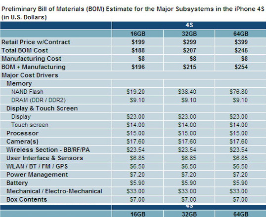 تتناقل المواقع ان تكلفة الاي فون 4s سعة 32 علي شركة ابل هي فقط 203$ و الذي يباع ب 749 $ و قيل ان المعالج A5 تكلفتة 26$ و الشاشة الريتنيا 31$ فقط ولا يعني ذلك ان ابل صافي ربحها 549$ لان ابل انفقت مليارات علي الابحاث و الضمان ووو لكن يعني ارقام خيالية فعلا.